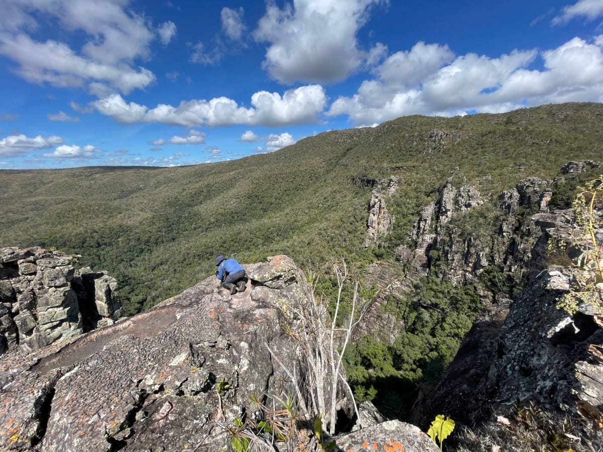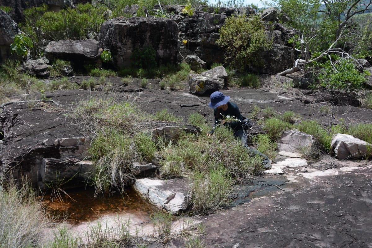Com essa questão em mente, Schindler e seus colegas embarcaram em uma jornada até a Chapada dos Veadeiros, o único local conhecido por Vellozia sessilis. O objetivo? Revisitar as áreas onde a espécie havia sido registrada e ampliar a busca por habitats semelhantes onde ela pudesse ser encontrada. Para isso, utilizaram modelos computacionais para identificar áreas com topografia, solo e clima similares que pudessem abrigar a espécie, e então as visitaram. A cada encontro com a espécie, anotavam as rochas, o solo, a vegetação e os sinais de perturbação humana ao redor, construindo um panorama detalhado de onde a planta pode sobreviver.